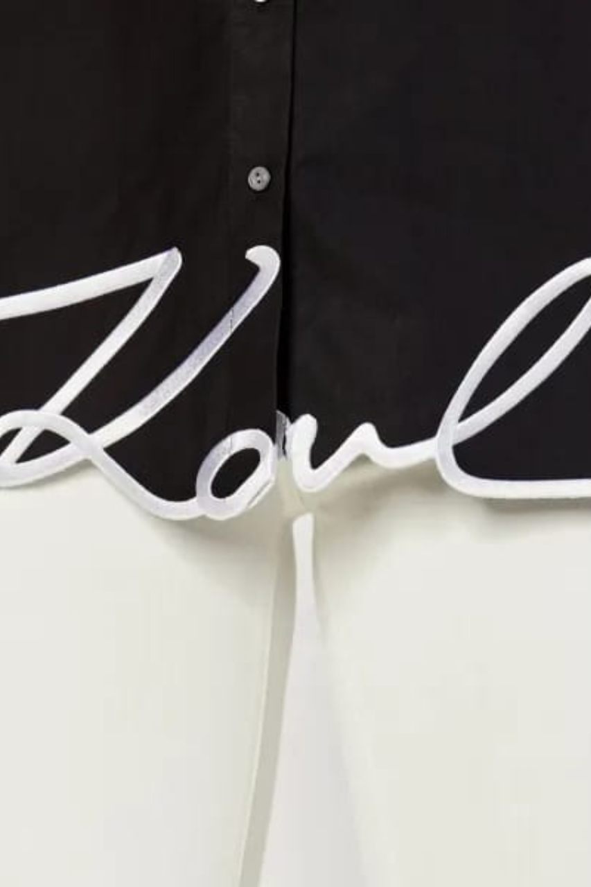 The classic collared shirt features a clean button placket and long sleeves with button cuffs, perfect for wearing as-is or rolled up for a more relaxed feel. The standout feature is the embroidered white cursive logo script elegantly tracing the lower hemline, adding a distinctive and modern designer touch.