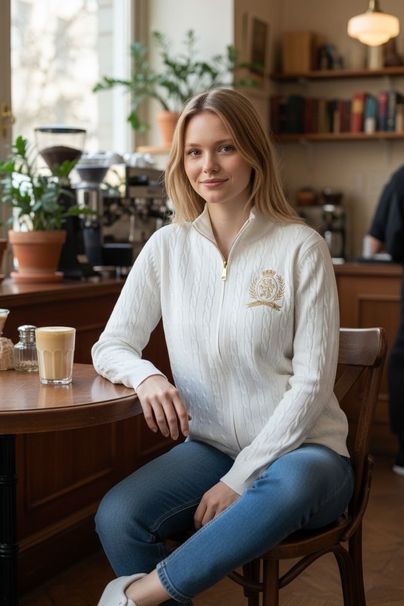 Elevate your everyday style with this classic zip-up knit sweater, designed to deliver both comfort and timeless elegance. Crafted from high-quality knit fabric, it features a soft, warm feel with a refined cable-knit texture and an elegant embroidered crest for a premium finish.